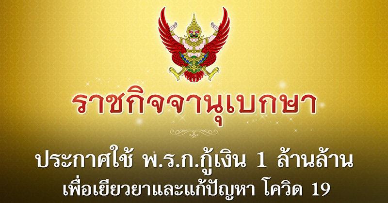 | • ราชกิจจานุเบกษา ประกาศใช้ พ.ร.ก.กู้เงิน 1 ล้านล้าน เพื่อเยียวยาและแก้ปัญหา โควิด 19 |