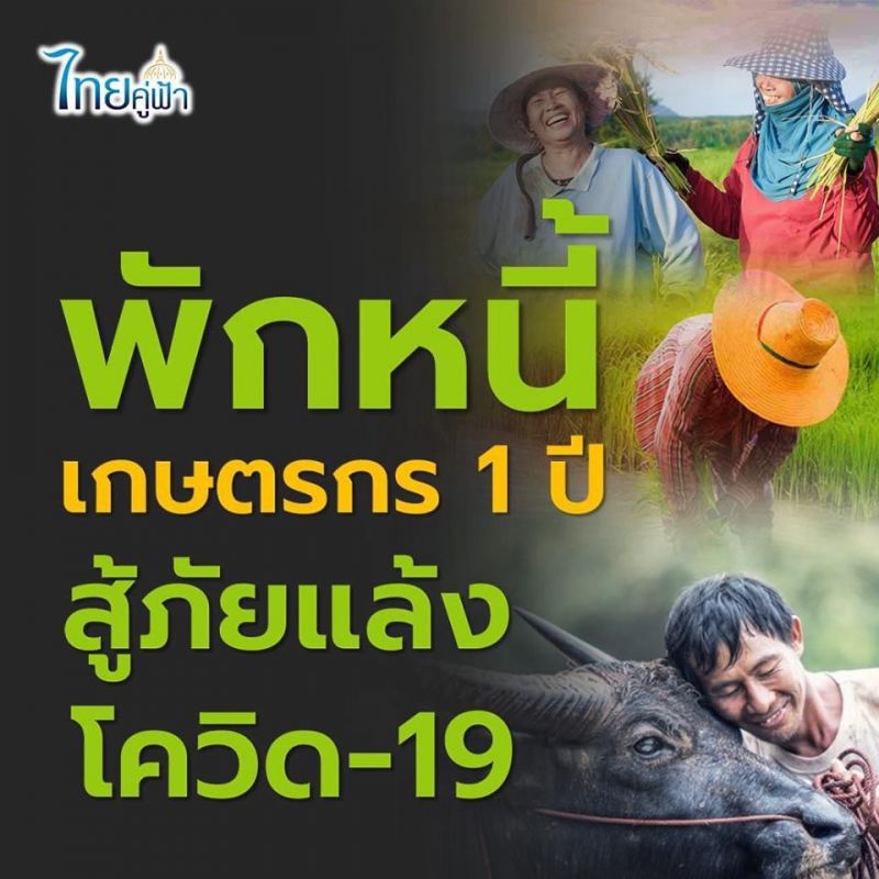 #ไทยคู่ฟ้า ข่าวดีสำหรับพี่น้องเกษตรกรที่เป็นลูกค้าของธนาคารเพื่อการเกษตรและสหกรณ์การเกษตร (ธ.ก.ส.) ที่ได้รับผลกระทบจากภัยธรรมชาติและการระบาดของโรคโควิด-19 ได้คลายความกังวลจากภาระหนี้สิน ล่าสุด ธ.ก.ส. ได้เพิ่มมาตรการช่วยเหลือให้แก่ลูกค้า โดยการพักชำระหนี้ต้นเงินและดอกเบี้ยเงินกู้ ที่ถึงกำหนดชำระตั้งแต่งวดเดือนเม.ย. 63 – งวดเดือนมี.ค. 64 เป็นเวลา 1 ปี โดยอัตโนมัติ และยังคงชั้นหนี้เดิมของลูกค้าก่อนเข้าโครงการฯ