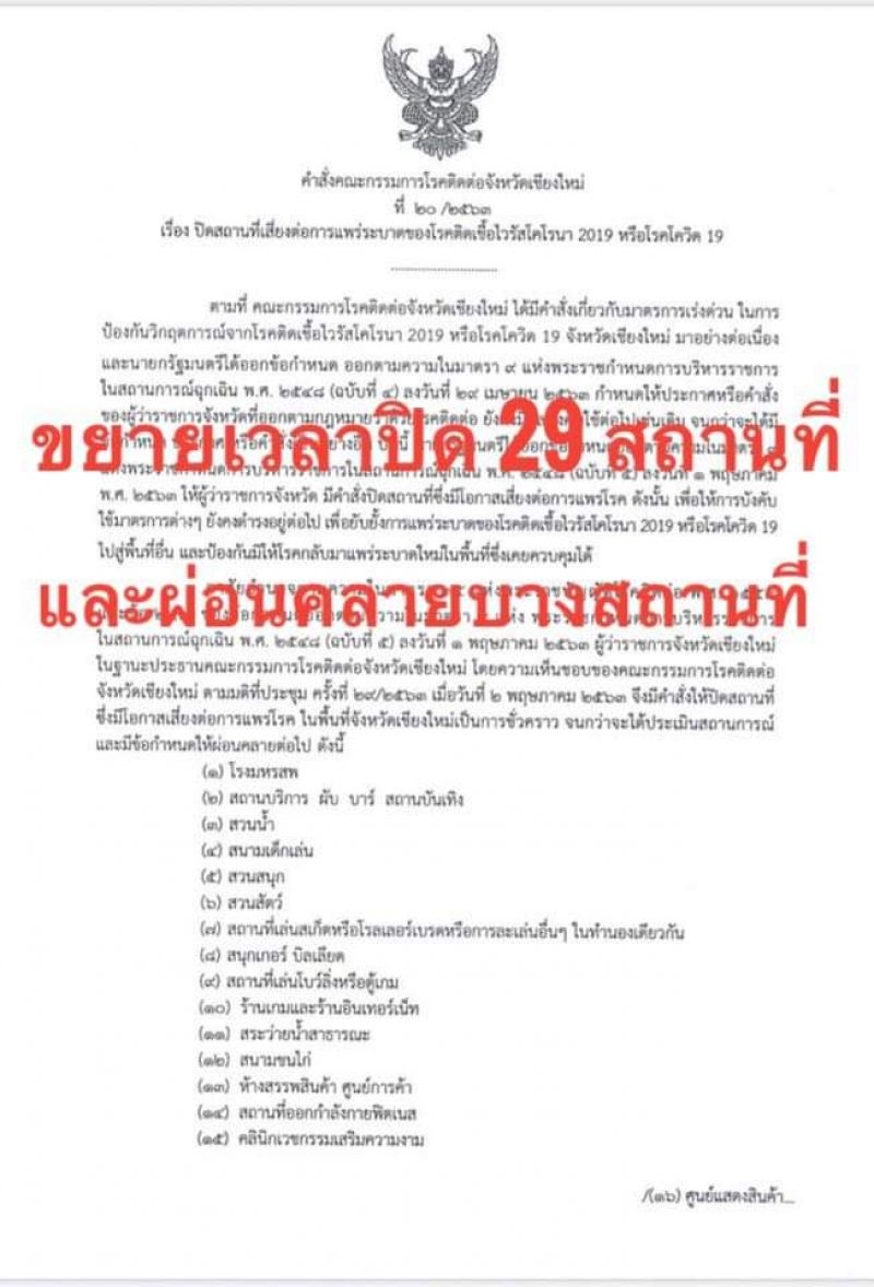 | • เชียงใหม่ประกาศ สถานทีผ่อนปรนเปิดได้ และ 29 สถานที่ ที่ยังต้องปิด |