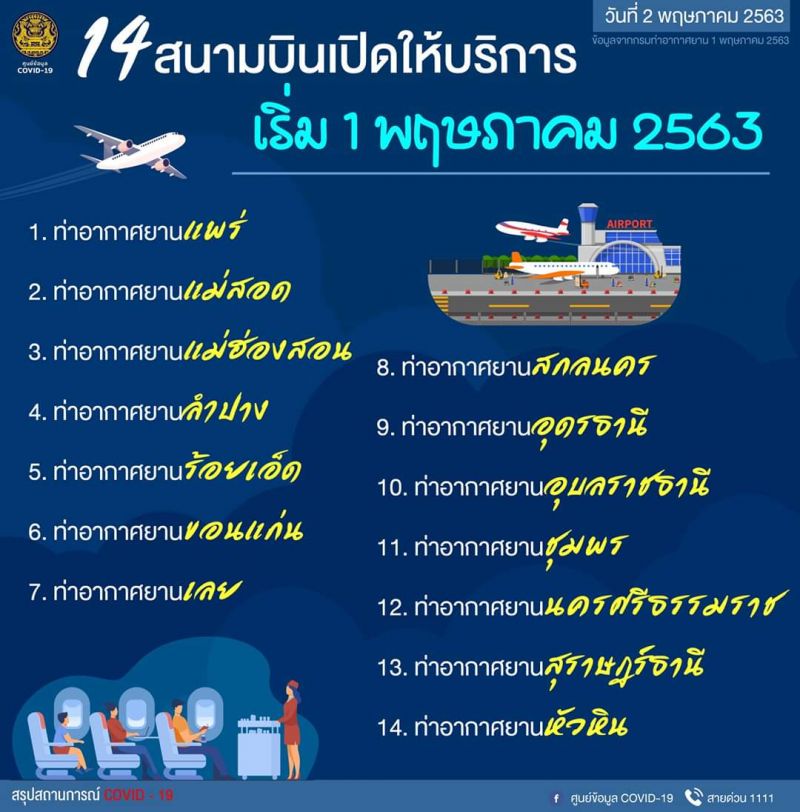 การเปิดให้บริการของสายการบินที่เริ่มให้บริการตั้งแต่วันที่ 1 พฤษภาคม 2563 โดยมีสายการบิน จำนวน 4 สายการบิน ได้แก่ สายการบินนกแอร์ สายการบินไทยแอร์เอเชีย สายการบินไทยไลอ้อนแอร์ และสายการบินไทยเวียตเจ็ท เปิดให้บริการ ณ ท่าอากาศยานของกรมท่าอากาศยาน จำนวน 14 แห่ง ได้แก่ ท่าอากาศยานลำปาง แม่สอด พิษณุโลก บุรีรัมย์ สกลนคร นครพนม ร้อยเอ็ด ขอนแก่น อุบลราชธานี อุดรธานี ตรัง นครศรีธรรมราช สุราษฎร์ธานี และกระบี่ ทั้งนี้ขอให้ผู้โดยสารทุกท่านกรุณาตรวจสอบ ประกาศ / คำสั่งจังหวัดที่เกี่ยวข้องกับการเดินทาง เพื่อการปฏิบัติตามประกาศของแต่ละจังหวัดได้อย่างถูกต้อง
