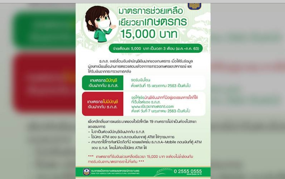 โดยจ่ายเงินให้แก่ครัวเรือนเกษตรกรที่ขึ้นทะเบียนเกษตรกรกับหน่วยงานของรัฐ รายละ 5,000 บาท เป็นระยะเวลา 3 เดือน (พ.ค. – ก.ค. 63) จำนวน 10 ล้านราย วงเงินงบประมาณจำนวน 150,000 ล้านบาท