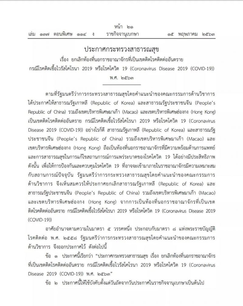 ตามที่รัฐมนตรีว่าการกระทรวงสาธารณสุขโดยคำแนะนำของคณะกรรมการด้านวิชาการ ได้ประกาศให้สาธารณรัฐเกาหลี (Republic of Korea) และสาธารณรัฐประชาชนจีน (People's Republic of China) รวมถึงเขตบริหารพิเศษมาเก๊า (Macao) และเขตบริหารพิเศษฮ่องกง (Hong Kong เป็นเขตติดโรคติดต่ออันตราย กรณีโรคติดเชื้อไวรัสโคโรนา 2019 หรือโรคโควิด 19 (Coronavirus Disease 2019 (COVID-19)) อย่างไรก็ดี สาธารณรัฐเกาหลี (Republic of Korea) และสาธารณรัฐ ประชาชนจีน (People's Republic of China) รวมถึงเขตบริหารพิเศษมาเก๊า (Macao) และ เขตบริหารพิเศษฮ่องกง (Hong Kong) ถือเป็นท้องที่นอกราชอาณาจักรที่มีความพร้อมด้านการแพทย์ และการสาธารณสุขในการแก้ไขสถานการณ์การแพร่ระบาดของโรคโควิต 19 ได้อย่างมีประสิทธิภาพ ดังนั้น เพื่อให้การป้องกันและควบคุมโรคโควิด 19 ที่อาจจะเข้ามาภายในราชอาณาจักรมีความเหมาะสม กับสถานการณ์ปัจจุบัน รัฐมนตรีว่าการกระทรวงสาธารณสุขโดยคำแนะนำของคณะกรรมการ ด้านวิชาการ จึง เห็นสมควรให้ประกาศยกเลิกสาธารณรัฐเกาหลี (Republic of Korea) และ สาธารณรัฐประชาชนจีน (People's Republic of China) รวมถึงเขตบริหารพิเศษมาเก๊า (Macao) และเขตบริหารพิเศษฮ่องกง (Hong Kong) จากการเป็นท้องที่นอกราชอาณาจักรที่เป็นเขต ติดโรคติดต่ออันตราย กรณีโรคติดเชื้อไวรัสโคโรนา 2019 หรือโรคโควิด 19 (Coronavirus Disease 2019