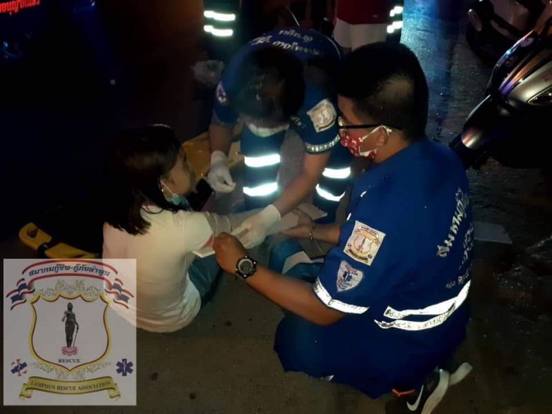 สมาคมทำการปฐมพยาบาลเบื้องต้น รถพยาบาลคันที่2 นำส่ง รพ.ลำพูน