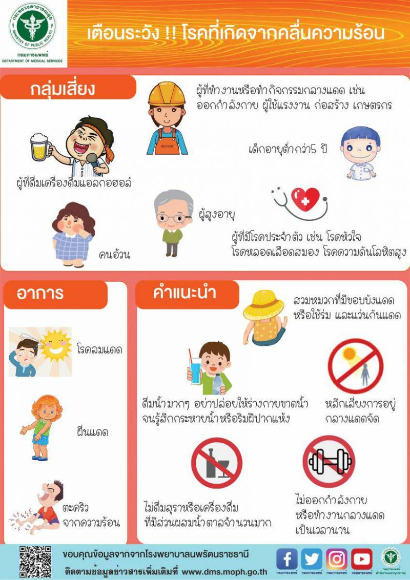 กรมการแพทย์ โดยโรงพยาบาลนพรัตนราชธานี เตือนประชาชนให้ระวังอันตรายจากการเปลี่ยนแปลงภูมิอากาศของประเทศไทย ทําให้เกิดปรากฏการณ์คลื่นความร้อนซึ่งมีผลต่อสุขภาพและทําให้เกิดโรคลมแดด ตะคริวจากความร้อน แนะนำดื่มน้ำมากๆ หลีกเลี่ยงการอยู่กลางแดดจัดและไม่ควรออกกำลังกายหรือทำงานกลางแดดเป็นเวลานาน