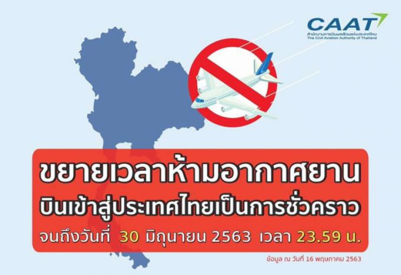 ขยายเวลา ห้ามเที่ยวบินระหว่างประเทศทำการบินเข้าสู่ประเทศไทยเป็นการชั่วคราว ตั้งแต่วันที่ 1 มิ.ย. 63 เวลา 00.01 น. จนถึงวันที่ 30 มิ.ย. 63 เวลา 23.59 น. เพื่อป้องกันมิให้สถานการณ์การระบาดของโรคติดเชื้อไวรัสโคโรนา 2019 (COVID 19) ภายในประเทศรุนแรงยิ่งขึ้นและสนับสนุนการแก้ไขสถานการณ์ฉุกเฉินข้างต้นให้ยุติลงโดยเร็ว