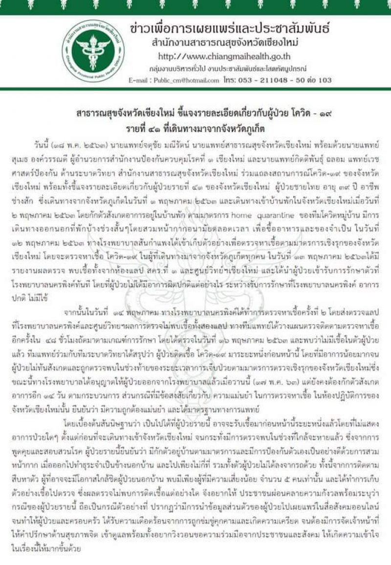 วันนี้ (๑๘ พศ. ๒๕๖๓) นายแพทย์จตุชัย มณีรัตน์ นายแพทย์สาธารณสุขจังหวัดเชียงใหม่ พร้อมด้วยนายแพทย์ สุเมธ องควรรณดี ผู้อำนวยการสำนักงานป้องกันควบคุมโรคที่ ๑ เชียงใหม่ และนายแพทย์กิตติพันธุ์ ฉลอม แพทย์เวช ศาสตร์ป้องกัน ด้านระบาดวิทยา สำนักงานสาธารณสุขจังหวัดเชียงใหม่ ร่วมแถลงสถานการณ์โควิศ - ของจังหวัด เชียงใหม่ พร้อมทั้งขี้แจงรายละเอียดเกี่ยวกับผู้ป่วยรายที่ ๔๑ ของจังหวัดเชียงใหม่ ผู้ป่วยชายไทย อายุ ๓๙ ปี อาชีพ ช่างสัก ซึ่งเดินทางจากจังหวัดภูเก็ตในวันที่ 9 พฤษภาคม ๒๕๖๓ และเดินทางเข้าบ้านพักในจังหวัดเชียงใหม่เมื่อวันที่ 6 พฤษภาคม ๒๕๒๓ โดยกัก ตัวสังเกตอาการอยู่ในบ้านพัก ตามมาตรการ horne quarantine ของทีมโควิดหมู่บ้าน มีการ เดินทางออกนอกที่พักบ้างช่วงสั้นๆ โดยสวมหน้ากากอนามัยต่ลอดเรสา เพื่อซื้ออาหารและของจำเป็น ในวันที่ ๒๒ พฤษภาคม ๒๕๖๓ ทางโรงพยาบาลสันกำแพงได้เข้าเก็บตัวอย่างเพื่อตรวจหาเชื้อตามมาตรการเชิงรุกของจังหวัด เชียงใหม่ โดยจะตรวจหาเชื้อ โควิท-19 ในผู้ที่เดินทางมาจากจังหวัดภูเก็ตทุกคน ในวันที่ ๑๓ พฤษภาคม ๒๕๖๓ได้มี รายงานผลตรวจ พบเชื้อทั้งจากห้องแลป สคร.ที่ 9 และศูนย์วิทย์ฯเชียงใหม่ และได้นำผู้ป่วยเข้ารับการรักษาตัวที่ โรงพยาบาลนครพิงค์ทันที โดยที่ผู้ป่วยไม่ให้มีอาการผิดปกติแต่อย่างไร ระหว่างรับการรักษาที่โรงพยาบาลนครพิงค์ อาการ ปกติ ไม่มีไข้