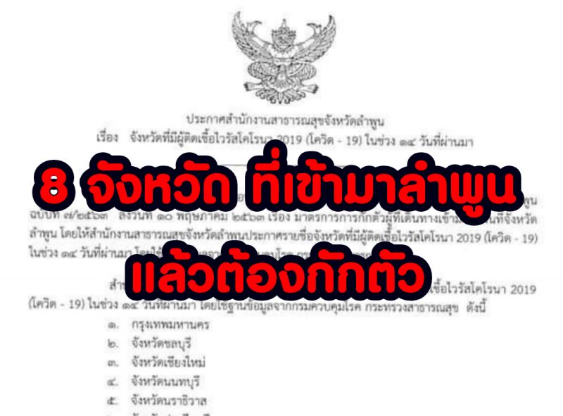 | • 8 จังหวัดที่เข้ามาลำพูนแล้วต้องกักตัว - 22พ.ค.63 |