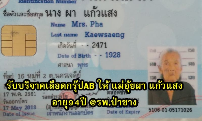 แอดมินได้รับข้อความ ขอรับบริจาคเลือดกรุ๊ปAB ซึ่งเป็นกรุ๊ปหายาก ให้กับ แม่อุ้ย ผา แก้วแสง อายุ 94ปี ที่โรงพยาบาลป่าซาง อ.ป่าซาง จ.ลำพูน   ในวันเวลาราชการ