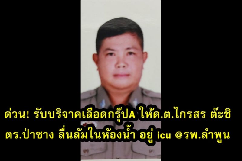 ด่วน! รับบริจาคเลือดกรุ๊ปA ให้ด.ต.ไกรสร ต๊ะชิ ตร.ป่าซาง ลื่นล้มในห้องน้ำ อยู่ icu @รพ.ลำพูน