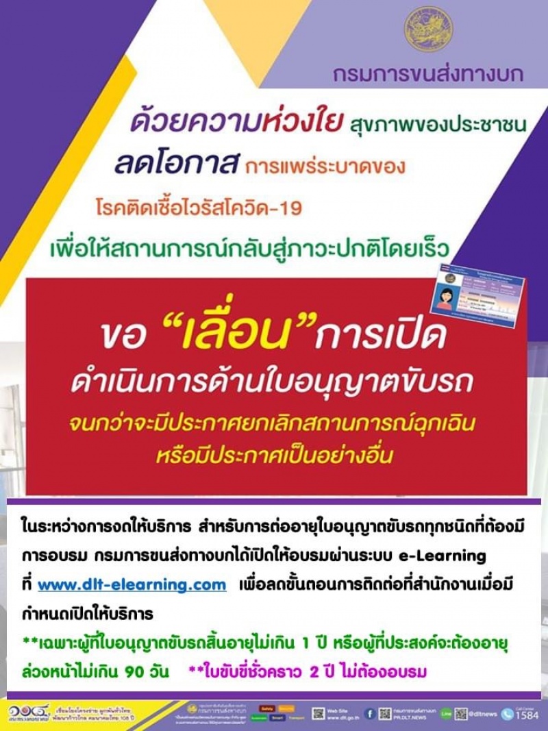 ในระหว่างการงดให้บริการ สำหรับการต่ออายุใบอนุญาตขับรถทุกชนิดที่ต้องมีการอบรม กรมการขนส่งทางบกได้เปิดให้อบรมผ่านระบบ e-Learning ที่ www.dlt-elearning.com เพื่อลดขั้นตอนการติดต่อที่สำนักงานเมื่อมีกำหนดเปิดให้บริการ