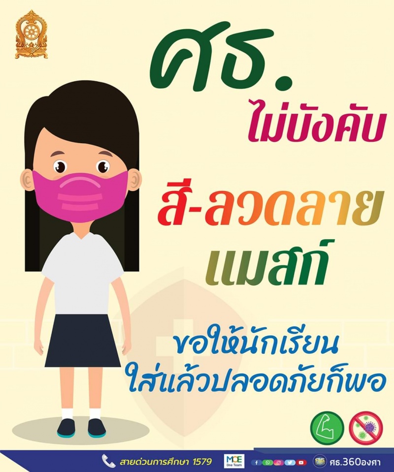 หลังจากมีการแชร์ รูปภาพในโลกอินเตอร์เน็ต เกี่ยวกับการกำหนดสีของหน้ากาก ของนักเรียนนักศึกษา วันนี้ รมว.ศึกษาธิการ "ณัฎฐพล ทีปสุวรรณ" ย้ำ #ไม่มีการบังคับสีและลวดลายหน้ากากอนามัย ขอให้นึกถึงความปลอดภัยนักเรียนเป็นหลัก ไม่ว่าจะมีลวดลายหรือไม่ก็ตาม ส่วนเลขาธิการ กพฐ. "อำนาจ วิชยานุวัติ" ให้โรงเรียนทุกแห่งยืดหยุ่นในเรื่องนี้ ขอให้ทุกคนในโรงเรียนสวมใส่เพื่อป้องกันการแพร่ระบาดเป็นหลัก