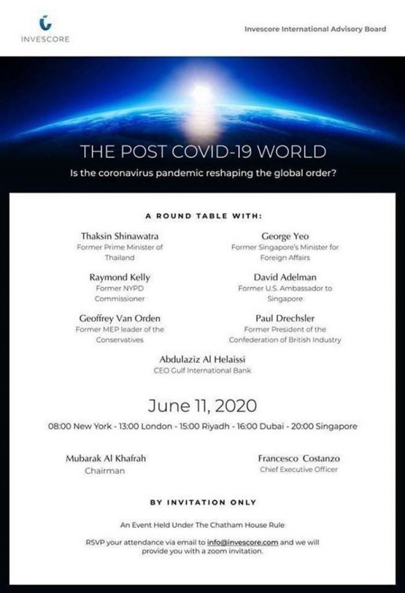 โดยมีรายงานว่า นายทักษิณจะร่วมเสวนาแบบทางไกลผ่านระบบออนไลน์ "ซูม" ร่วมกับจอร์จ โย อดีตรัฐมนตรีต่างประเทศสิงคโปร์ เรย์มอนด์ เคลีย์ อดีตคณะกรรมการตำรวจนครนิวยอร์ก เดวิด อเดลแมน อดีตเอกอัครรัฐทูตสหรัฐฯประจำสิงคโปร์ เจฟฟรีย์ ฟาน ออร์เดน อดีตส.ส.พรรคอนุรักษ์นิยมของอังกฤษ และพอล เดรสเลอร์ อดีตประธานสภาอุตสาหกรรมอังกฤษ ในวันที่ 11 มิถุนายน 25963 นี้ ตามเวลาไทย 19.00 น.