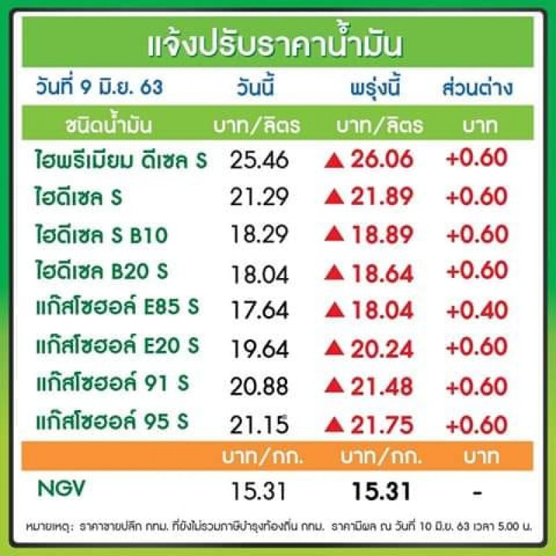 ปรับราคาน้ำมันขึ้น 0.60บาท มีผลตั้งแต่เวลา 05.00 น. วันที่ 10 มิ.ย. 63