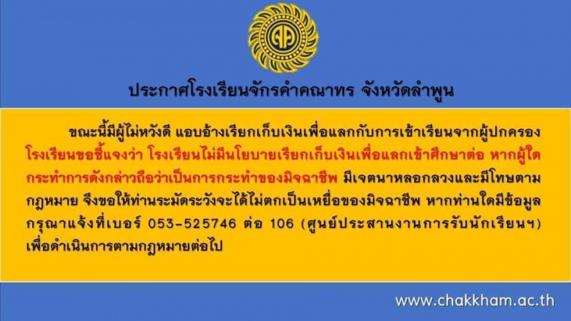 จักรคำฯ เตือนมิจฉาชีพ เรียกเงินเพื่อยัดเข้าโรงเรียน
