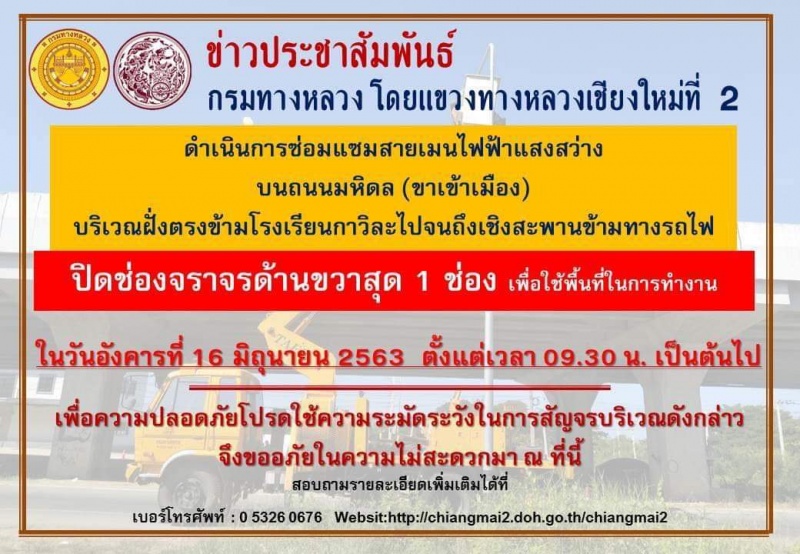 ในวันที่ 16 มิถุนายน 2563 เวลา 09.30 น. เป็นต้นไป แขวงทางหลวงเชียงใหม่ที่ 2 จะดำเนินการซ่อมแซมสายเมนไฟฟ้าแสงสว่าง บนถนนมหิดล (ขาเข้าเมือง)บริเวณฝั่งตรงข้ามโรงเรียนกาวิละไปจนถึงเชิงสะพานข้ามทางรถไฟ จึงขอปิดช่องจราจรด้านขวาสุด 1ช่อง เพื่อใช้พื้นที่ในการทำงาน เพื่อความปลอดภัยโปรดใช้ความระมัดระวังในการสัญจรบริเวณดังกล่าวจึงขออภัยในความไม่สะดวกมา ณ ที่นี้