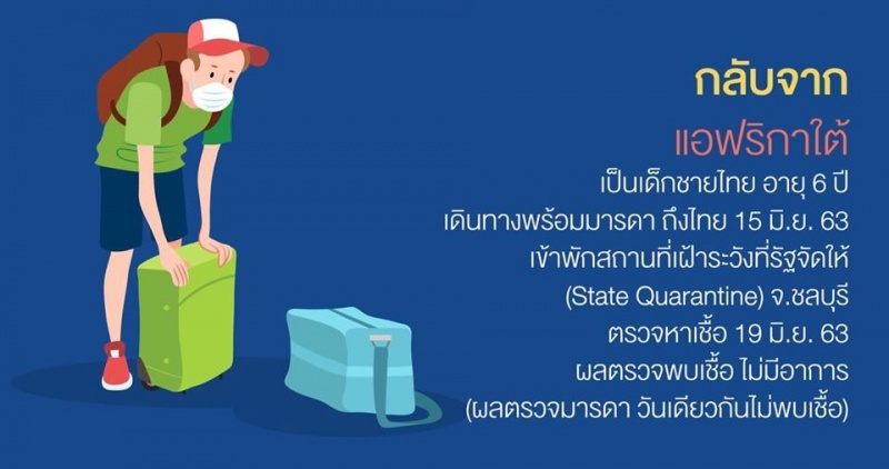 -ผู้ป่วยรายใหม่ 1 ราย (ผู้ที่เดินทางมาจากต่างประเทศ และเข้า State Quarantine จากสาธารณรัฐแอฟริกาใต้ เพศชาย อายุ 6 ปี มาถึงไทยเมื่อวันที่ 15 มิถุนายนแบบไม่แสดงอาการ ส่วนมารดา ยังไม่พบเชื้อ)