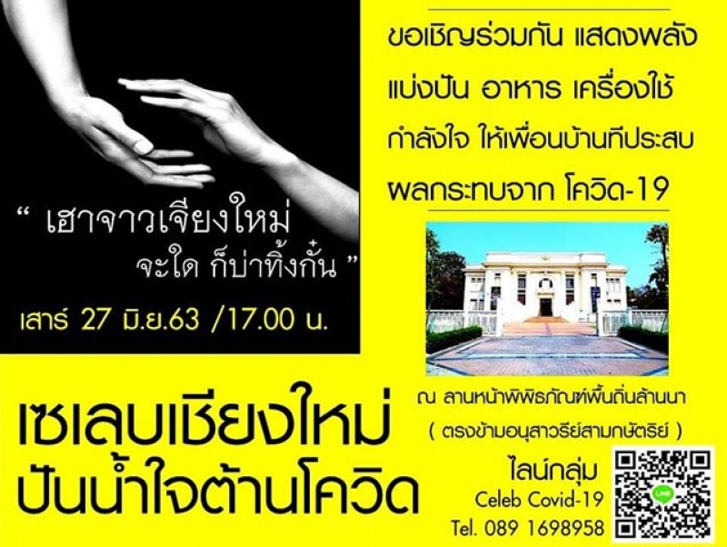 | • 27มิถุนา63 เชิญร่วมงาน "เซเลบเชียงใหม่ ปันน้ำใจต้านภัยโควิด ...เฮาจาวเจียงใหม่ จะใดก่อบ่าทิ้งกั๋น" |
