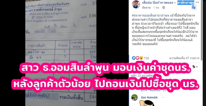 | • ชื่นชม สาว ธ.ออมสินลำพูน มอบเงินค่าชุดนร. หลังลูกค้าตัวน้อย ไปถอนเงินไปซื้อชุด นร. |