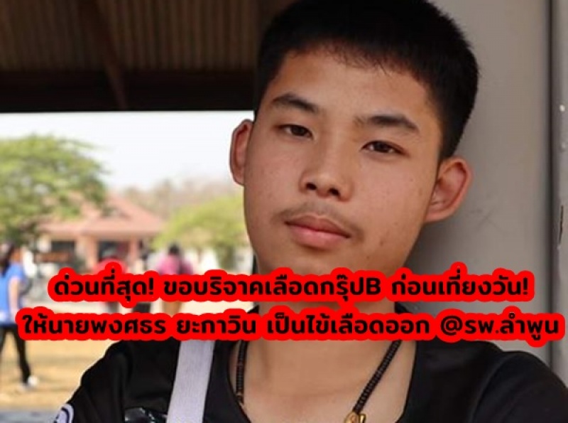 ด่วนที่สุด! ขอบริจาคเกล็ดเลือดกรุ๊ปB หรือทุกกรุ๊ป ก่อนเที่ยงวัน!!! ให้นายพงศธร ยะกาวิน คนแม่ตืน อ.ลี้ จ.ลำพูน ป่วยเป็นไข้เลือดออก