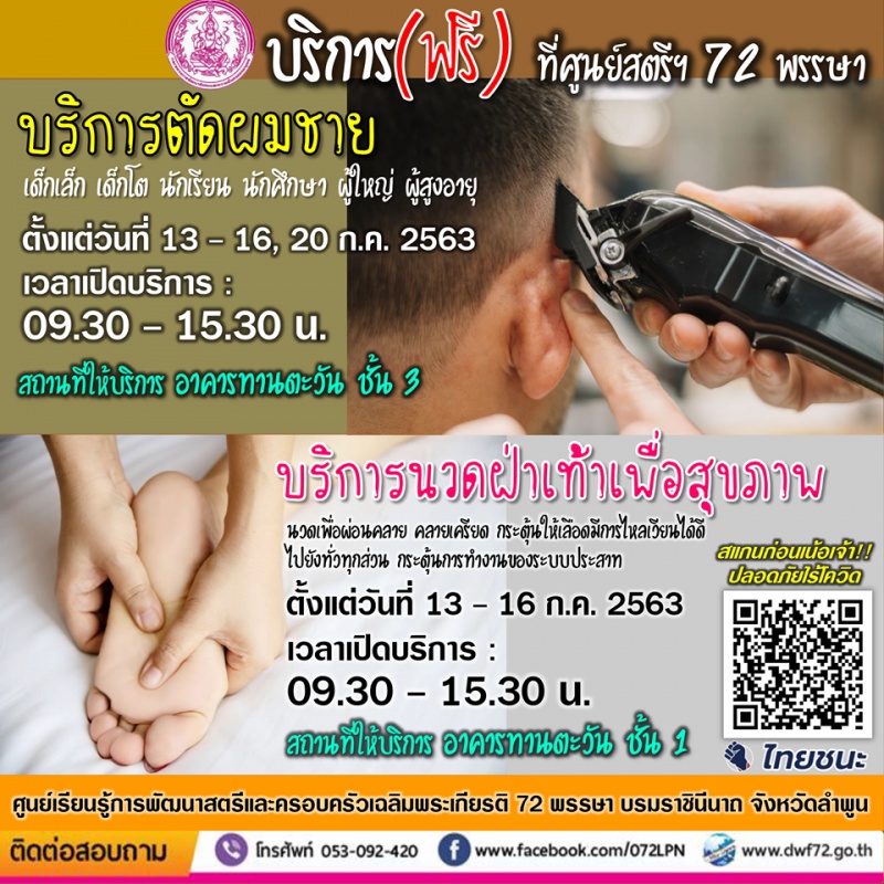 | • ตัดผม-นวดเท้าฟรี! 13-16ก.ค.63 @ศูนย์สตรีฯ 72พรรษา ลำพูน โทร.053-092420 |