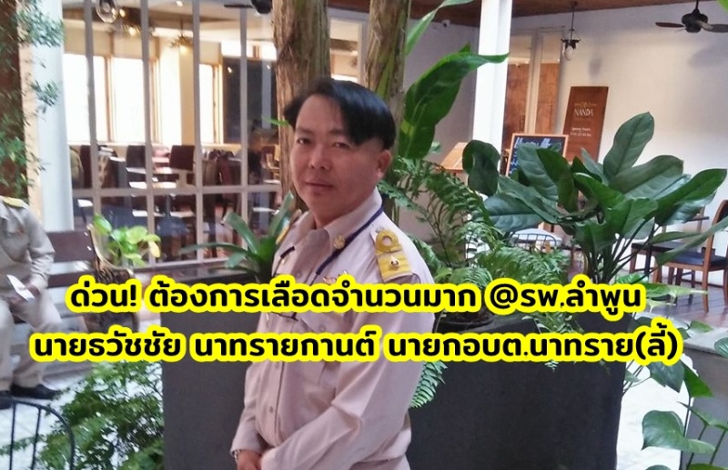 ด่วน! นายธวัชชัย นาทรายกานต์ นายกอบต.นาทราย(ลี้) ต้องการเลือดจำนวนมาก @รพ.ลำพูน