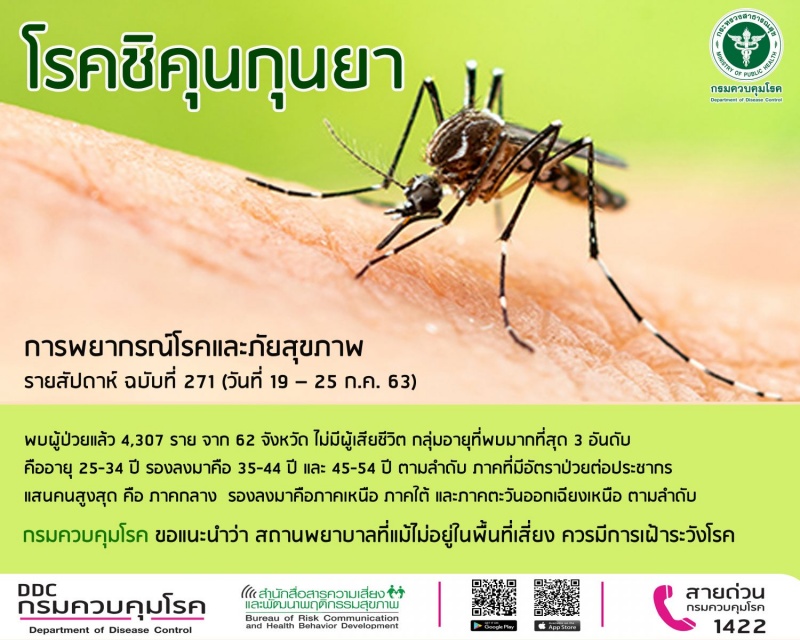“การพยากรณ์โรคและภัยสุขภาพประจำสัปดาห์นี้ คาดว่าช่วงนี้มีโอกาสจะพบผู้ป่วยโรคไข้ปวดข้อยุงลายเพิ่มขึ้น จากการพบผู้ป่วยกระจายทั่วทุกภูมิภาคของประเทศไทย และพบผู้ป่วยเป็นกลุ่มก้อนในหลายจังหวัด ซึ่งปัจจุบันพบว่าผู้ป่วยโรคนี้ไม่ได้จำกัดอยู่เฉพาะพื้นที่ภาคใต้ สามารถพบผู้ป่วยในภาคอื่นๆ ได้เช่นกันประกอบกับยังมีฝนตกในหลายพื้นที่ต่อเนื่อง ทำให้เอื้อต่อการเกิดแหล่งเพาะพันธุ์ลูกน้ำยุงลายได้ โรคไข้ปวดข้อยุงลายหรือโรคชิคุนกุนยา เป็นโรคติดต่อนำโดยแมลง มียุงลายเป็นพาหะ ผู้ที่ติดเชื้อจะมีอาการไข้สูง ปวดข้อ ข้อบวมหรือข้ออักเสบร่วมกับมีอาการปวดศีรษะ ปวดกระบอกตา ปวดเมื่อยกล้ามเนื้อ มีผื่นหรืออ่อนเพลีย การป้องกันโรคที่ดีที่สุด คือ การจัดการสิ่งแวดล้อมภายในบ้านและนอกบ้าน ด้วยมาตรการ “3 เก็บ ป้องกัน 3 โรค” คือ เก็บบ้าน เก็บขยะ และเก็บน้ำ เพื่อกำจัดแหล่งเพาะพันธุ์ลูกน้ำยุงลาย ซึ่งเป็นพาหะของโรคไข้เลือดออก โรคติดเชื้อไวรัสซิกา และโรคไข้ปวดข้อยุงลายหรือโรคชิคุนกุนยา นอกจากนี้ ควรป้องกันไม่ให้ถูกยุงลายกัด ด้วยการทายากันยุง กำจัดยุงในบ้าน และการนอนกางมุ้ง กรมควบคุมโรค ขอแนะนำว่า สถานพยาบาลที่แม้ไม่อยู่ในพื้นที่เสี่ยง ควรมีการเฝ้าระวังโรคไข้ปวดข้อยุงลาย เนื่องจากยุงลายซึ่งเป็นพาหะนำโรคสามารถพบได้ทุกจังหวัด โดยการคัดกรองผู้ป่วยที่มาด้วยอาการ ไข้ ปวดข้อ มีผื่น หรือมีอาการคล้ายไข้เลือดออกแต่เกล็ดเลือดอยู่ในระดับปกติ และเมื่อพบผู้ป่วยควรรายงานผู้สงสัยหรือผู้ป่วยต่อหน่วยงานสาธารณสุขในพื้นที่ เพื่อดำเนินการควบคุมโรคอย่างรวดเร็ว สอบถามข้อมูลเพิ่มเติมโทรสายด่วนกรมควบคุมโรค โทร. 1422”
