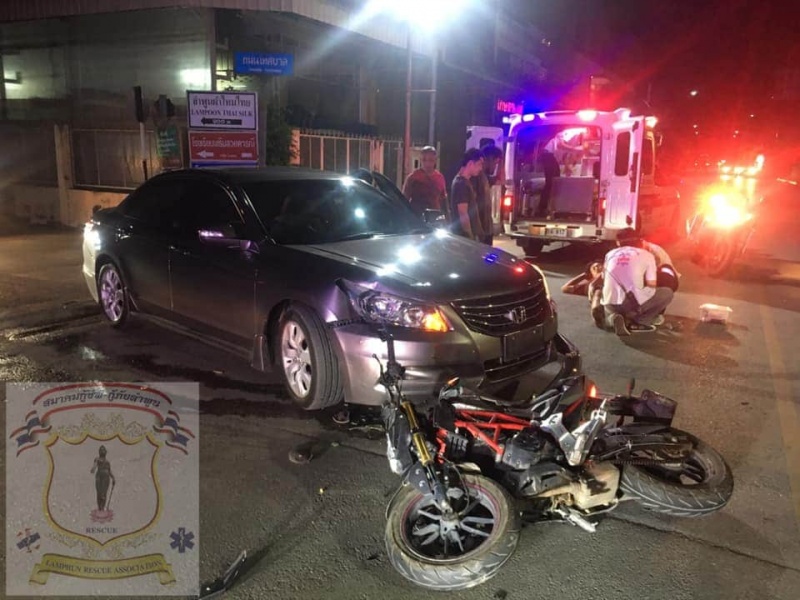 จยย. ชนกับ เก๋ง เจ็บ 1ราย @สี่แยกเทศบาลลำพูน