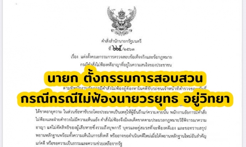 | • นายก ตั้งกรรมการสอบสวน กรณีกรณีไม่ฟ้องนายวรยุทธ อยู่วิทยา |