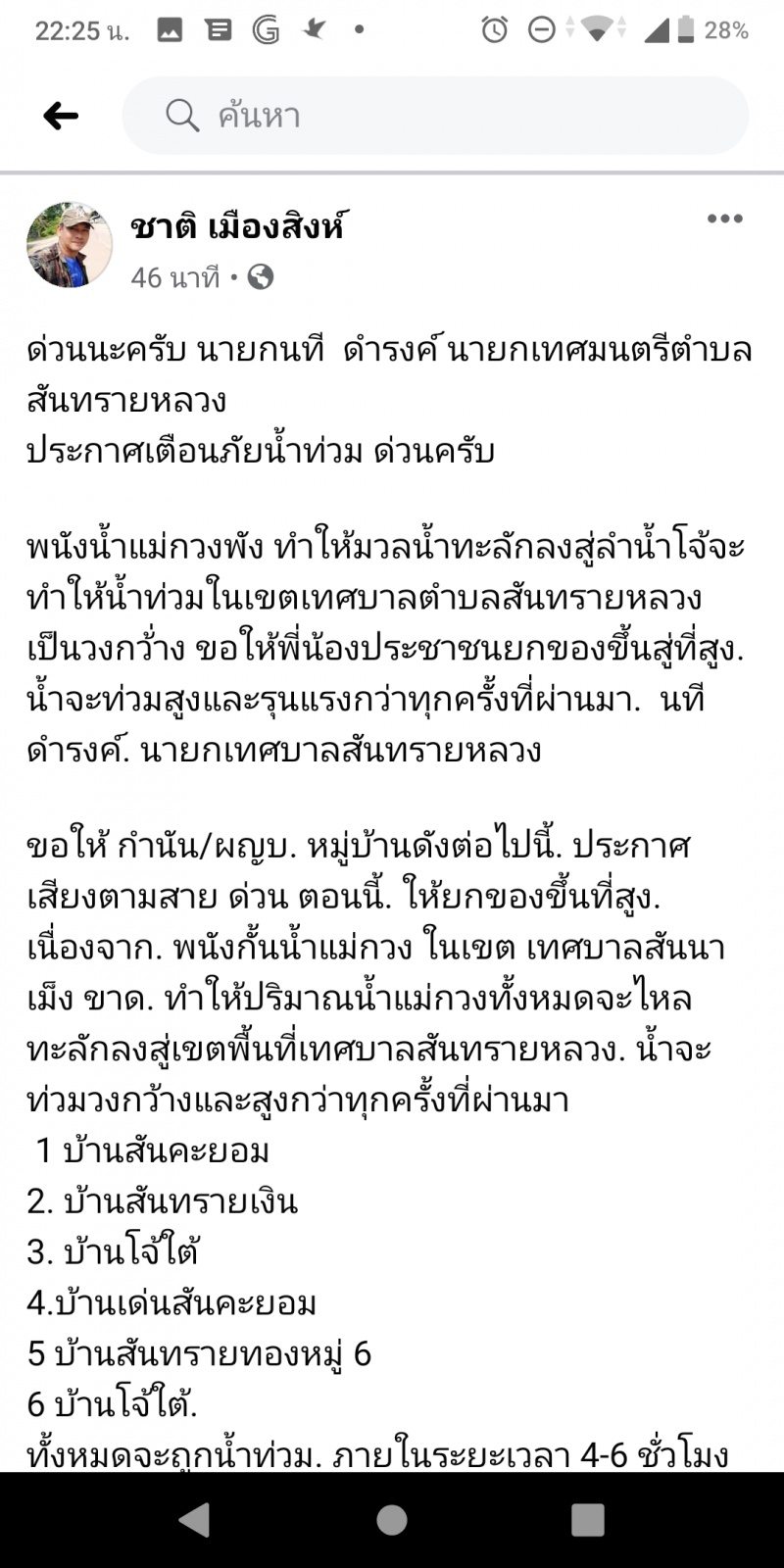 ขอให้ กำนัน/ผญบ. หมู่บ้านดังต่อไปนี้. ประกาศเสียงตามสาย ด่วน ตอนนี้. ให้ยกของขึ้นที่สูง. เนื่องจาก. พนังกั้นน้ำแม่กวง ในเขต เทศบาลสันนาเม็ง ขาด. ทำให้ปริมาณน้ำแม่กวงทั้งหมดจะไหลทะลักลงสู่เขตพื้นที่เทศบาลสันทรายหลวง. น้ำจะท่วมวงกว้างและสูงกว่าทุกครั้งที่ผ่านมา