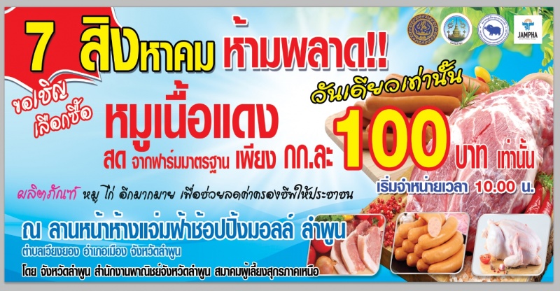 | • ห้ามพลาด! ขายหมูกิโลละ100.- หน้าแจ่มฟ้าช๊อปปิ้งมอล์ 7สิงหา เริ่ม 10.00น. |