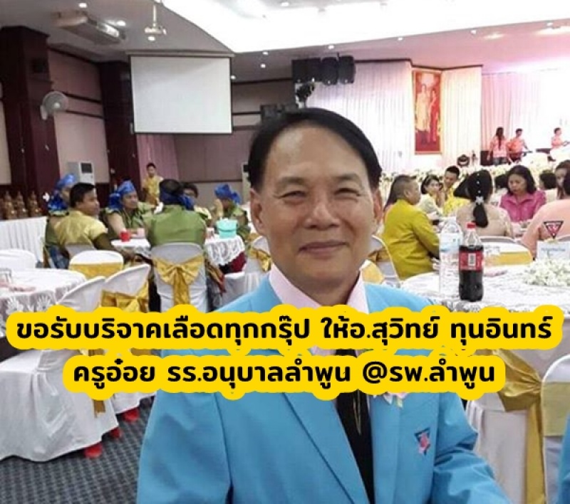 ขอรับบริจาคเลือดทุกกรุ๊ป ให้ อ.สุวิทย์ ทุนอินทร์(ครูอ๋อย) ครู รร.อนุบาลลำพูน @รพ.ลำพูน