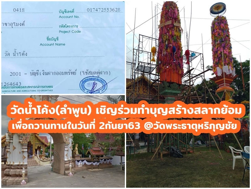 ขอเชิญร่วมผู้มีจิตศรัทธา รว่มสมทบทุนสร้างต้นสลากย้อมของวัดน้ำโค้ง ต.หนองช้างคืน อ.เมือง จ.ลำพูน เพื่อจะนำไปถวายทานยังวัดพระธาตุหริภุญชัย ในวันที่2 กันยายน 2563 ในงานบุญใหญ่สลากย้อมหนึ่งเดียวในโลกจังหวัดลำพูน งานเริ่ม27สิงหาคม-2กันยายน2563เป็นวันถวายทาน