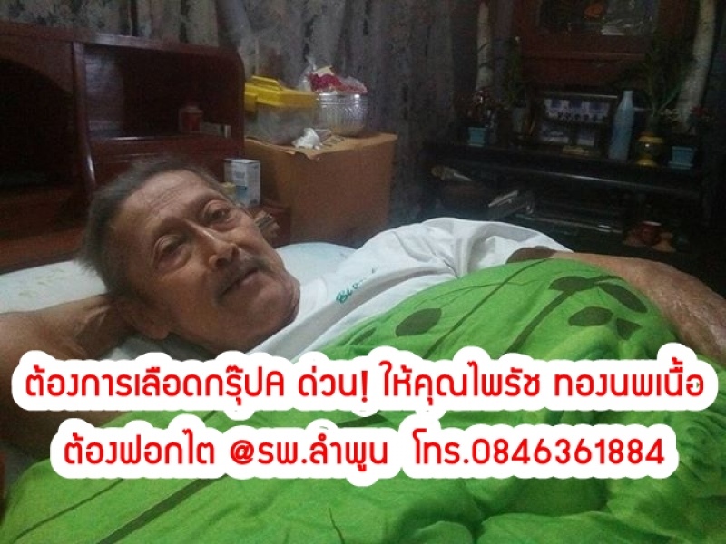 ขอบริจาคเลือดกรุ๊ปA ด่วน! ให้คุณไพรัช ทองนพเนื้อ อายุ77ปี ต้องฟอกไต @รพ.ลำพูน โทร.0846361884