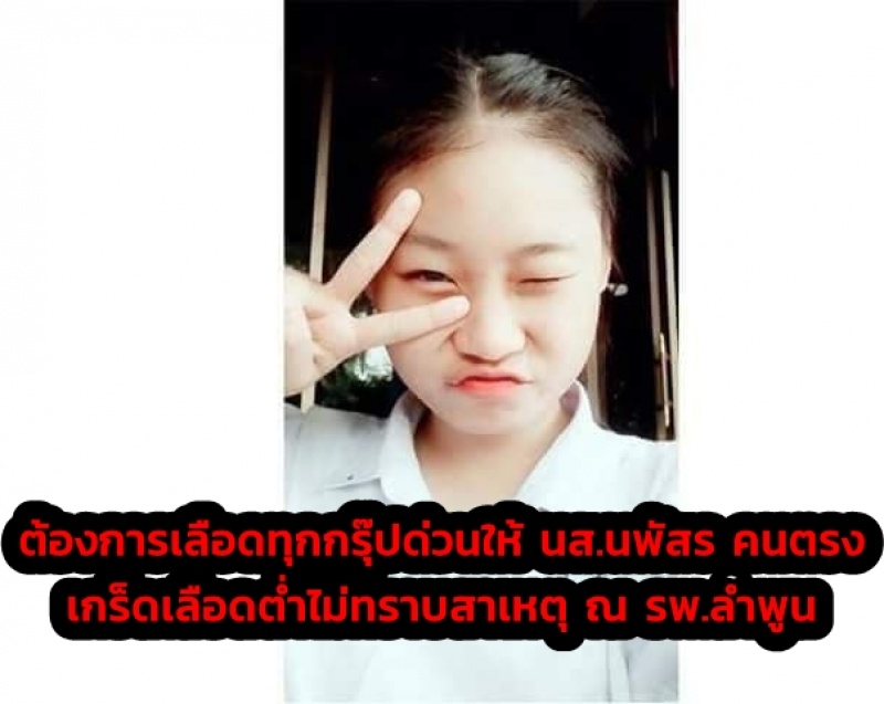 ต้องการเลือดทุกกรุ๊ปด่วนให้ นส.นพัสร คนตรง(นุ๊กนิ๊ก) เกร็ดเลือดต่ำไม่ทราบสาเหตุ ณ รพ.ลำพูน