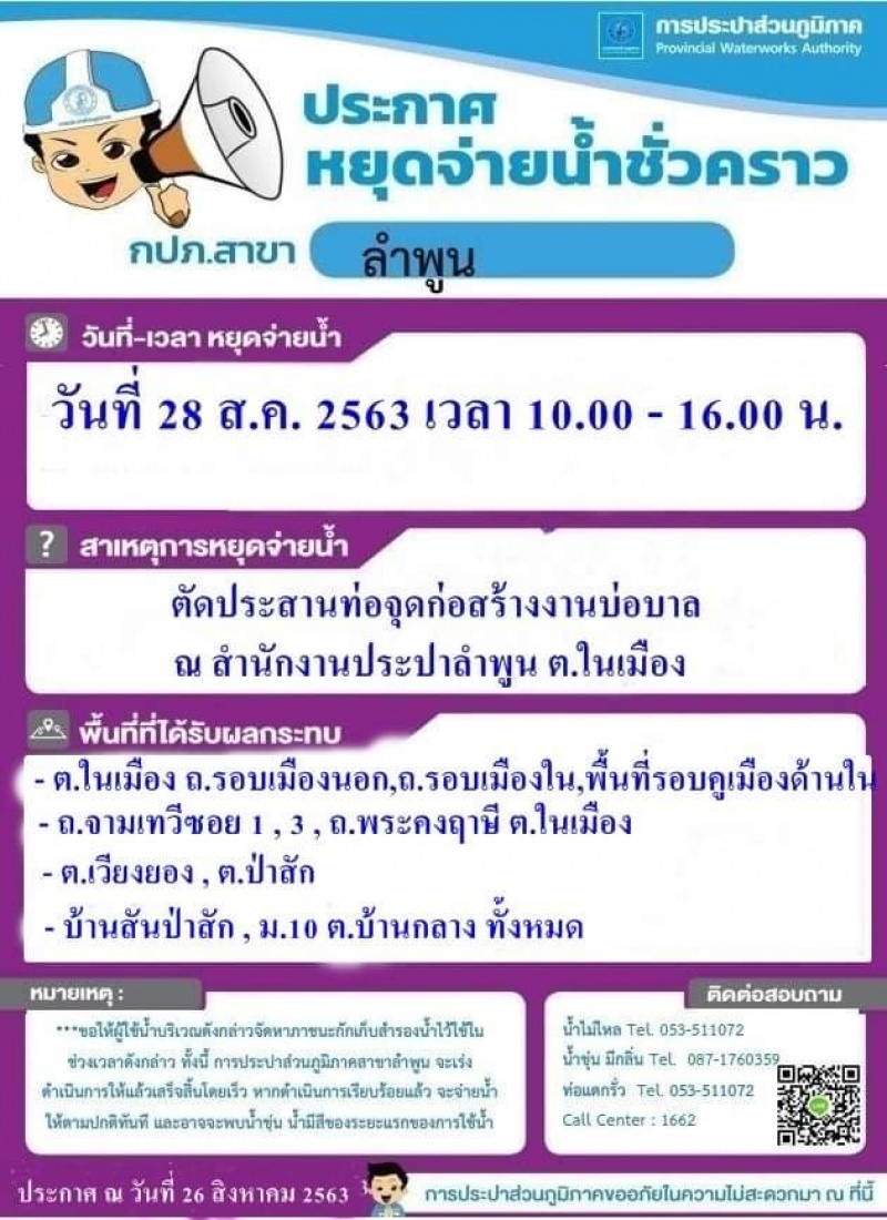 ในความไม่สะดวก สอบถาม โทร 053-511072  Line : มั่นใจ กปภ.สาขาลำพูน ,  facebook page การประปาส่วนภูมิภาคสาขาลำพูน
