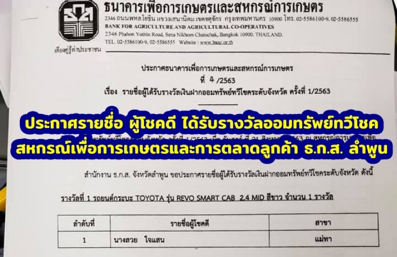 ธกส.ลำพูน ประกาศรายชื่อ ผู้โชคดี ได้รับรางวัลออมทรัพย์ทวีโชค