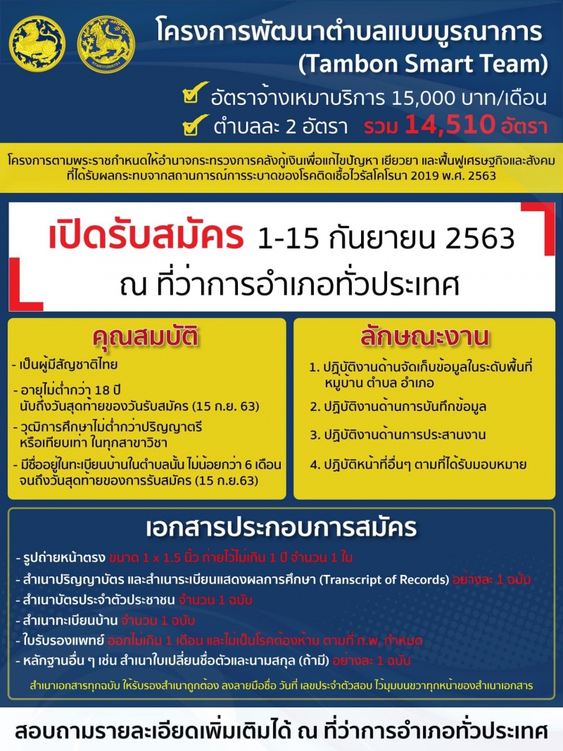 -จำนวนและอัตราจ้าง: ตำบลละ 2 อัตรา รวม 14,510 อัตรา ระยะการจ้าง 12 เดือน (1 ตุลาคม 2563 – 30 กันยายน 2564) อัตราจ้างเหมา 15,000 บาท/เดือน