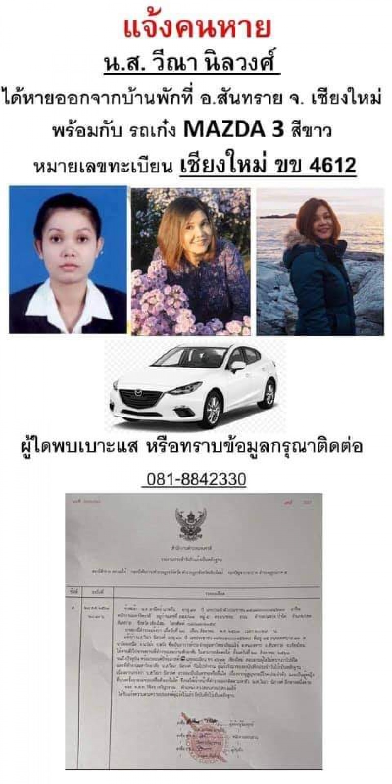 #แจ้งคนหาย น.ส.วีณา นิลวงศ์ พร้อม รถเก๋ง MAZDA 3 สีขาว เชียงใหม่ ขข 4612 ได้หายออกจากบ้านพักและสถานที่ทำงาน ไม่สามารถติดต่อได้ตั้งแต่วันที่ 23 ส.ค. ที่ผ่านมา หากใครพบหรือมีข้อมูลช่วยติดต่อกลับมาได้ที่เบอร์ 081-8842330