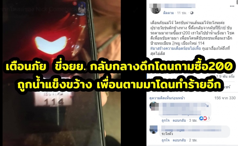 | • เตือนภัย สาวขี่จยย. กลับกลางดึกโดนถามซื้อ200 เพื่อนตามมาโดนทำร้ายอีก @แม่โจ้ |