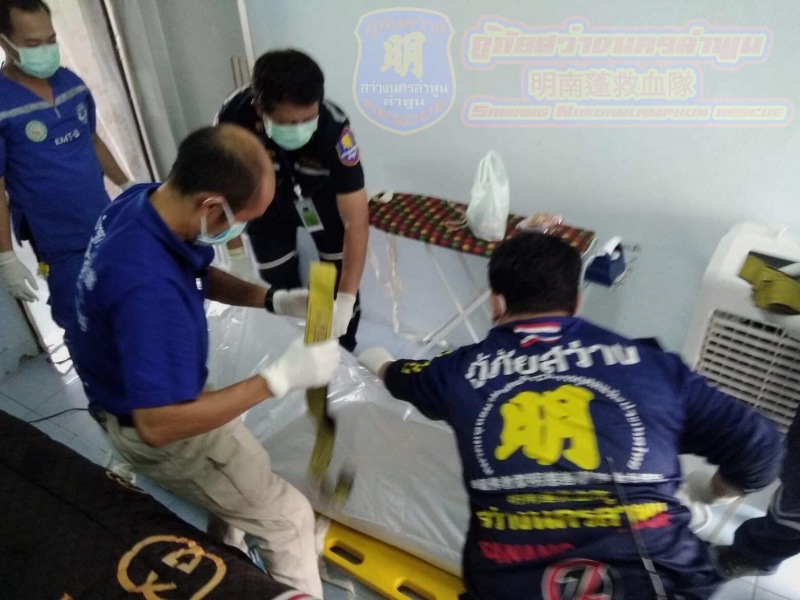 เมื่อวันที่08 กันยายน 63 อเวลา 13.53น. หน่วยกู้ภัยสว่างนครลำพูน รับแจ้งจาก สภ.นิคมฯ ขอสนับสนุนรถส่งศพเหตุเสียชีวิตไม่ทราบสาเหตุ หอพักแห่งหนึ่งบ้านปูเลย ต.มะเขือเเจ้ อ.เมือง จ.ลำพูน หน่วยกู้ภัยสว่างนครลำพูนจัดเจ้าหน้าที่อาสาสมัครออกตรวจสอบร่วมกับทีมกู้ชีพสายทิพย์(มะเขือแจ้)กู้ชีพโรงพยาบาลหริภุญชัยฯ ณ จุดเกิดเหตุ