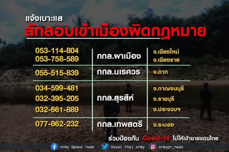 | • เปิดเบอร์แจ้งเบาะแส!! ลักลอบเข้าเมืองตามแนวชายแดนเสี่ยงแพร่กระจายโควิด-19 |
