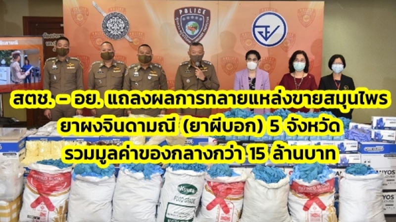 สตช. - อย. แถลงผลการทลายแหล่งขายสมุนไพรยาผงจินดามณี (ยาผีบอก) ใน 5 จังหวัด ได้แก่ กำแพงเพชร พิษณุโลก ขอนแก่น ลพบุรี และมหาสารคาม ได้ของกลางกว่า 4 หมื่นซอง และตรวจยึดถุงมือทางการแพทย์เถื่อน ย่านหนองแขม กรุงเทพฯ กว่า 9 แสนคู่ มูลค่าของกลางทั้งสิ้นกว่า 15 ล้านบาท