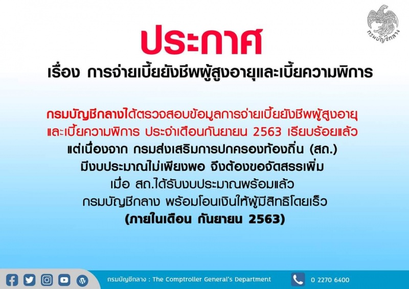 ทั้งนี้ กรมบัญชีกลางห่วงใยและเข้าใจในความจำเป็นของผู้มีสิทธิทุกท่าน เมื่อ สถ.ได้รับงบประมาณเรียบร้อยแล้วกรมบัญชีกลางจะดำเนินการจ่ายให้ผู้มีสิทธิอย่างเร่งด่วนต่อไป (ภายในเดือน กันยายน 2563) ทั้งนี้ ขอให้ติดตามข่าวจาก facebook กรมบัญชีกลาง อย่างใกล้ชิด หรือ สามารถสอบถามเพิ่มเติมได้ที่ Call Center กรมบัญชีกลาง 02 270 6400 ในวัน เวลาทำการ” โฆษกกรมบัญชีกลาง กล่าว #กรมบัญชีกลาง #เบี้ยยังชีพผู้สูงอายุ การจ่ายเงินเบี้ยยังชีพผู้สูงอายุและเงินเบี้ยความพิการ เดือนกันยายน 63