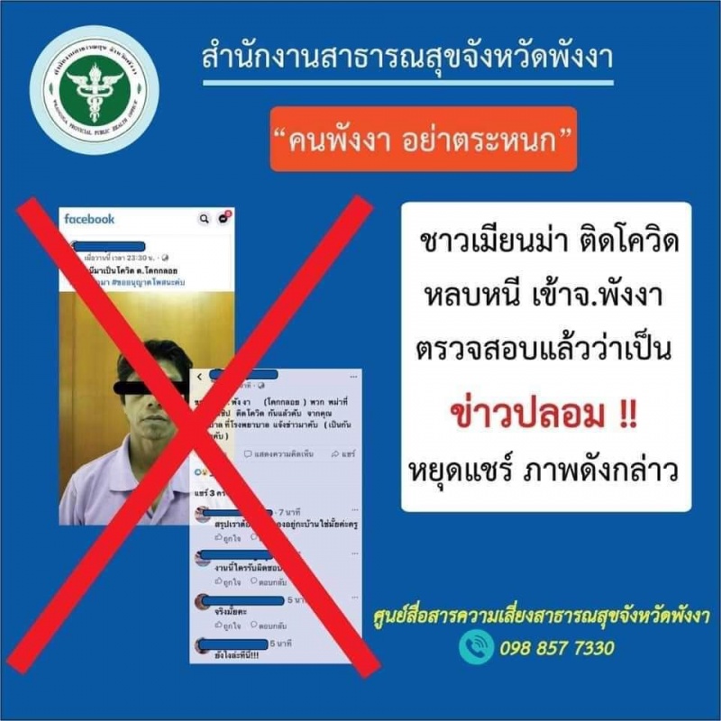 | • ข่าวปลอม! ชาวเมียนมาติดโควิด หลบหนีเข้า จ.พังงา |