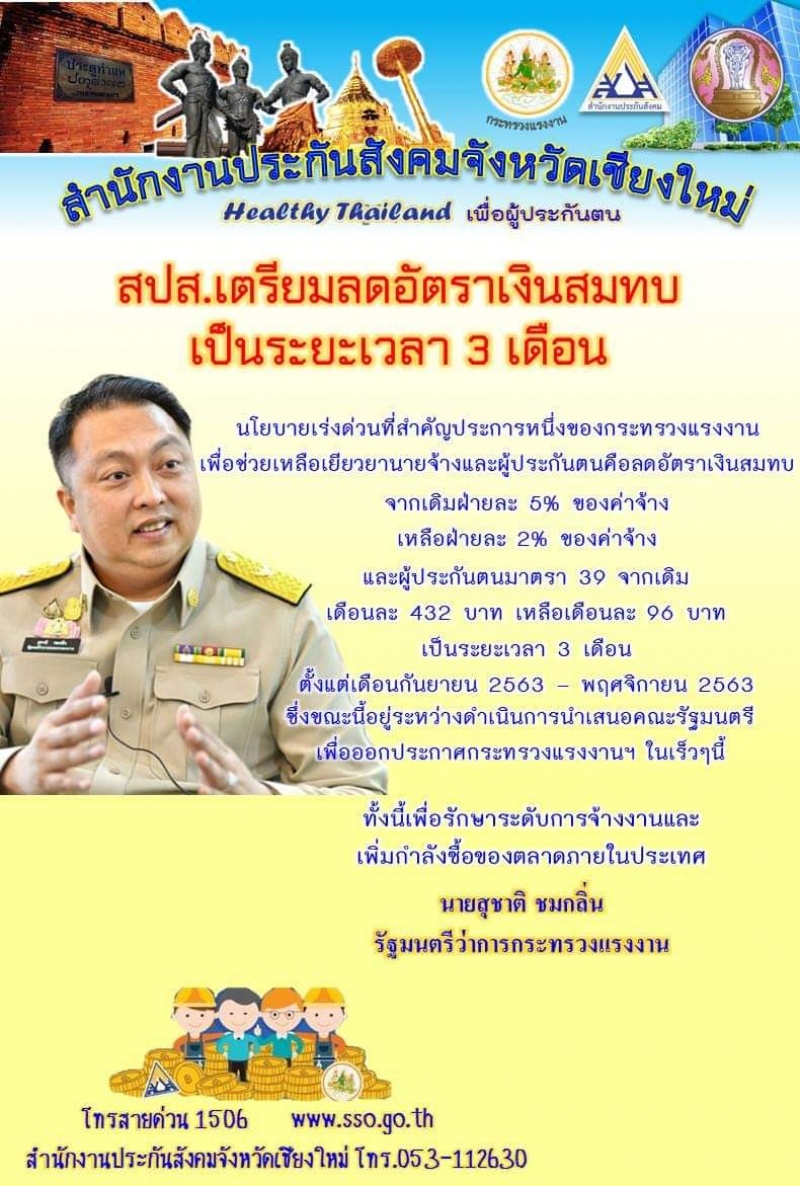 ประกาศแล้ว เพื่อช่วยเหลือเยียวยานายจ้างและผู้ประกันตนคือลดอัตราเงินสมทบ จากเดิมฝ่ายละ 5% ของค่าจ้าง เหลือฝ่ายละ 2% ของค่าจ้าง และผู้ประกันตนมาตรา 39 จากเดิม เดือนละ 432 บาท เหลือเดือนละ 96 บาท เป็นระยะเวลา 3 เดือน ตั้งแต่เดือนกันยายน 2563 พฤศจิกายน 2563