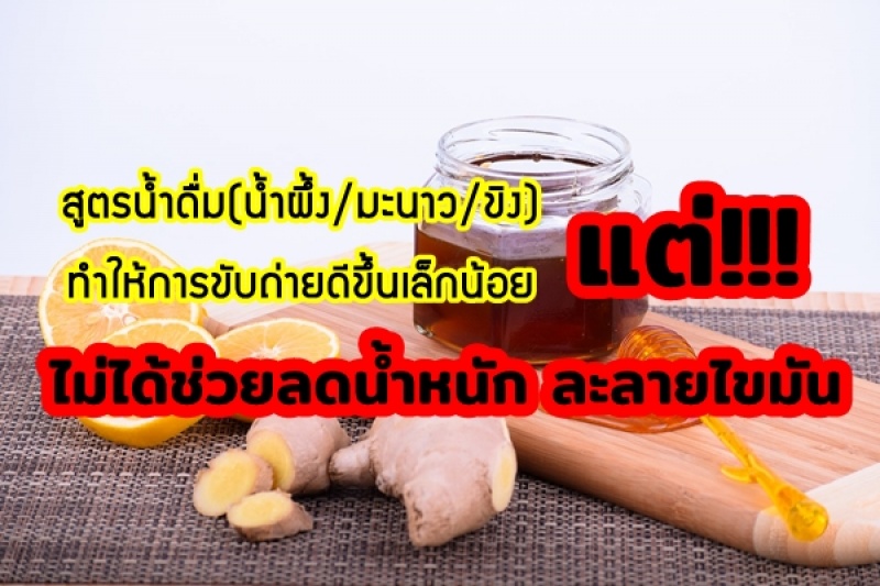 | • สูตรน้ำดื่ม น้ำมะนาว น้ำผึ้ง ขิง และว่านหางจระเข้ ไม่ได้ช่วยละลายไขมัน ลดน้ำหนัก ทำให้การขับถ่ายดีขึ้นเล็กน้อยเท่านั้น |