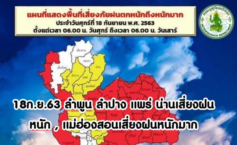 | • 18ก.ย.63 ลำพูน ลำปาง แพร่ น่านเสี่ยงฝนหนัก , แม่ฮ่องสอนเสี่ยงฝนหนักมาก |