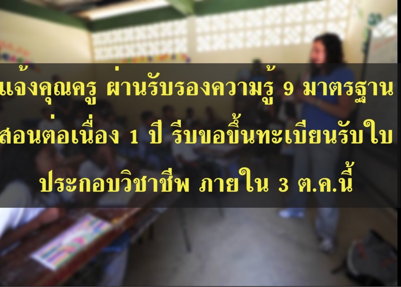 | • แจ้งคุณครู ผ่านรับรองความรู้ 9 มาตรฐาน สอนต่อเนื่อง 1 ปี รีบขอขึ้นทะเบียนรับใบประกอบวิชาชีพ ภายใน 3 ต.ค.นี้ |