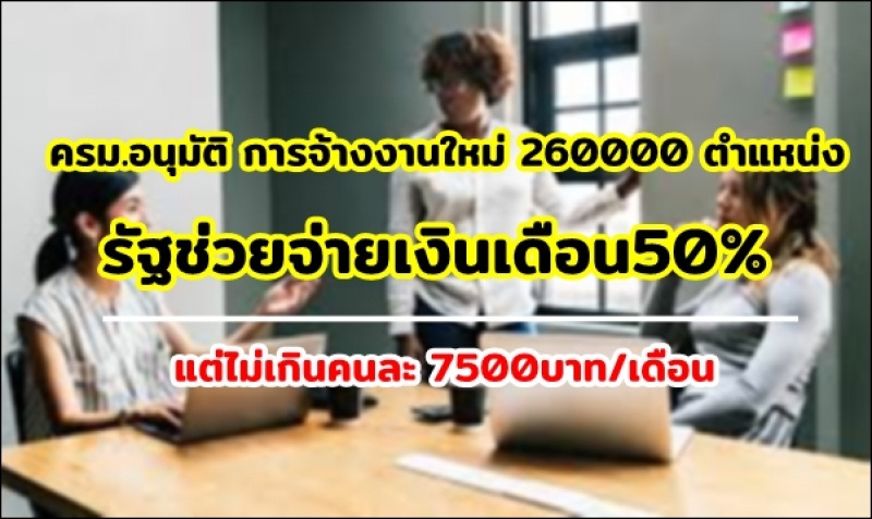 ครม.อนุมัติ การจ้างงานใหม่ 260000 ตำแหน่ง รัฐช่วยจ่ายเงินเดือน50% แต่ไม่เกินคนละ 7500บาท/เดือน
