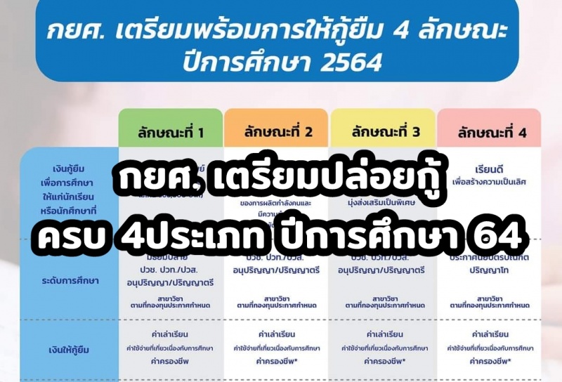 กองทุนเงินให้กู้ยืมเพื่อการศึกษา (กยศ.) เตรียมให้กู้ยืมครบ 4 ลักษณะ ในปีการศึกษา 2564 เพื่อเพิ่มความสะดวกในการยื่นกู้ยืมเงิน ให้นักเรียนนักศึกษาเข้าถึงโอกาสทางการศึกษามากขึ้น ลดดอกเบี้ยสำหรับผู้ที่ขาดแคลนทุนทรัพย์ เพื่อส่งเสริมให้เรียนสาขาวิชาที่เป็นความต้องการหลัก สาขาวิชาขาดแคลน และให้กู้ยืมในระดับประกาศนียบัตรบัณฑิตและปริญญาโทสำหรับผู้กู้ที่เรียนดี โดยมีรายละเอียดดังนี้